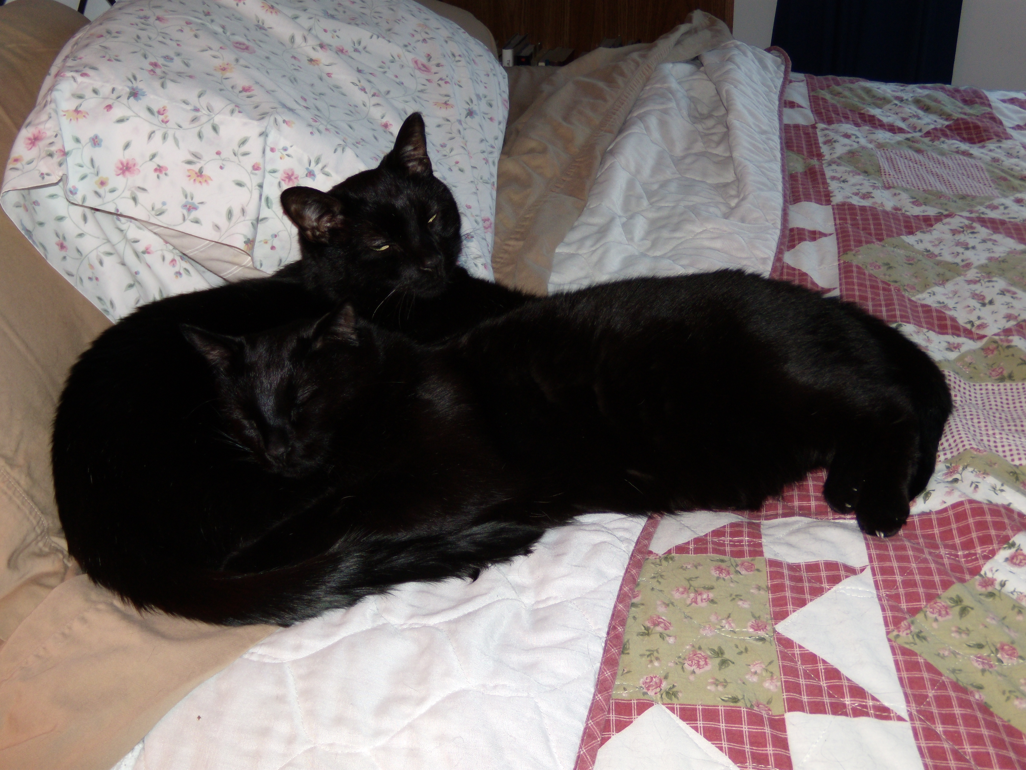 The cats wanted out in the garage but came roaring back in less than five minutes—sweet house-bound softies! They sleep, curled into each other on the bed, blanket made into a warm nest. I bet they said a prayer of thanks. As for praying, I began meditating again after twenty years of absence. I made five minutes but forgot to turn off the radio, so was concentrating more n Obama and Pakistan than ooom.