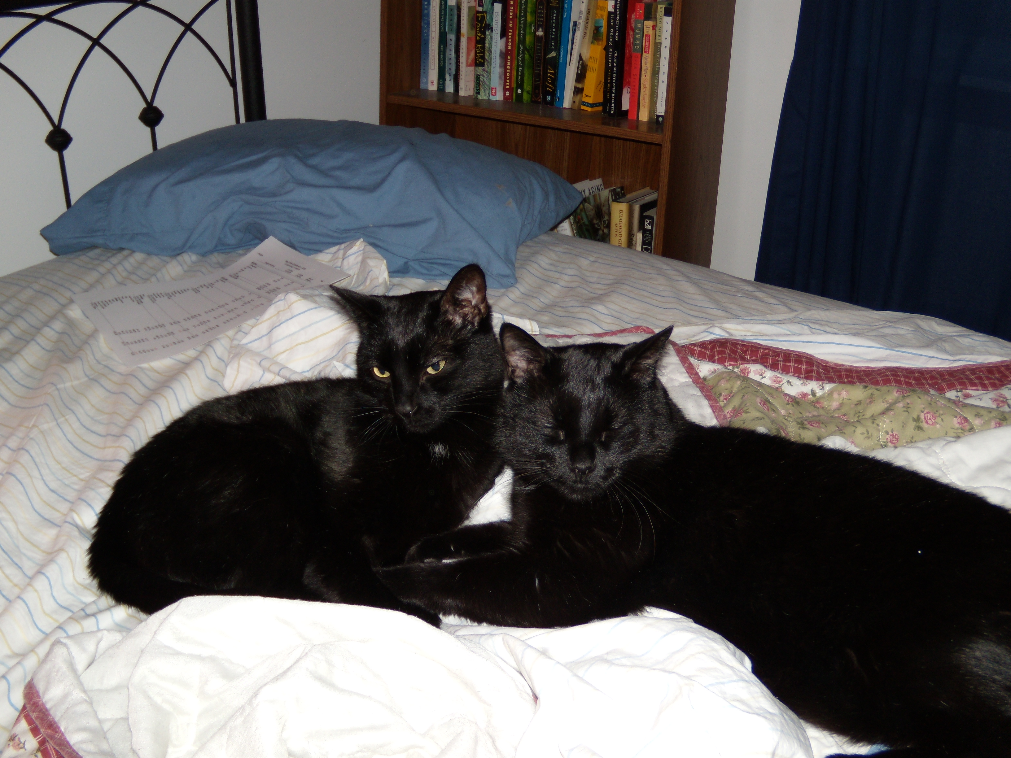This is what my babies looked like just two short weeks ago. Something happened then to piss them off and they have been fighting every since. We’ve tried everything–sprays, separating them, pretending to be mother cat and scruffing them down and hissing at them, etc. Still no luck. The cat (Jake) that was the alpha cat is under attack by the other one (Simon). Simon stalks Jake, then Jake growls and hisses, then Simon does and pretty soon it begins to sound like a hill full of coyotes, all vocalizing. The latest thing we’ve tried are collars for each of them with a scent like mother pheramones which is supposed to calm them down. A little maybe, but still stalking and hissing. We took the one under attack, Jake, into the vet yesterday to have him checked over as we had a suggestion that maybe he was ill and the other cat was taking advantage of his weakness. So far, he’s healthy but we have to wait for the blood test to come back. Such goings on! I sure hope it doesn’t come down to a pill for either of them (as I wrote before, pilling a cat is no fun and little successful.) I’ll keep you posted. The only other thing that happened was that my first husband died and we wonder if he’s lurking about trying to get my goat or my cat as it were.