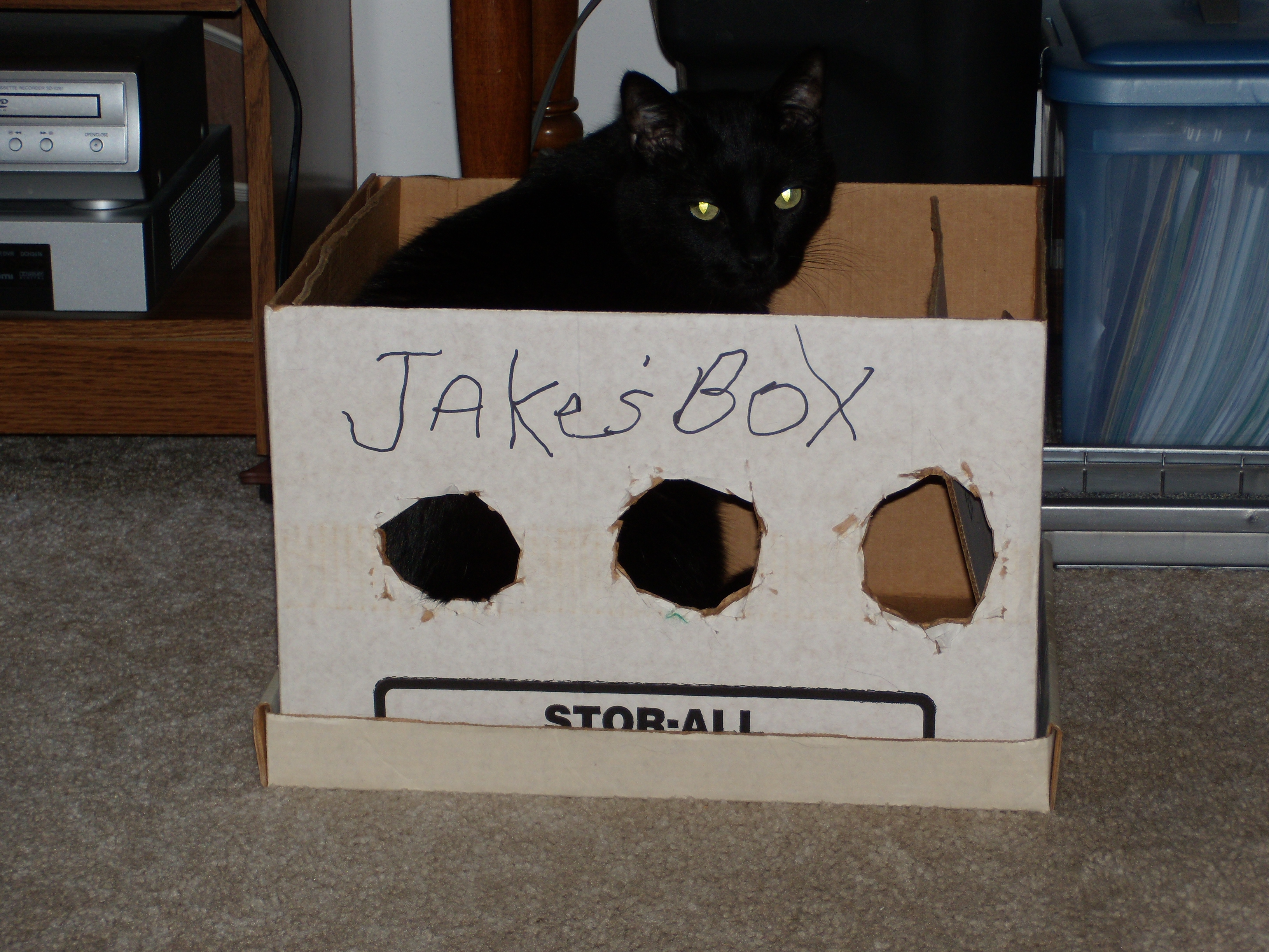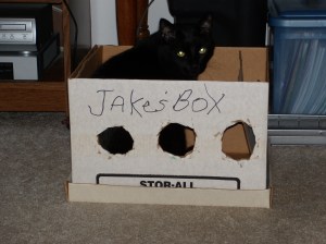 This is where I wish Jake were–but he’s not; he’s up in the cupboard over the refrigerator or on the soffit around the kitchen. This is Simon in Jake’s box and that is the story the way it is these days around here–one cat in the cupboard and one having the freedom to roam. This morning we had another incident–woke me out of a sound sleep, hissing and growling and things falling to the floor. Simon had Jake backed up to a wall and Jake was slashing at Simon because he couldn’t get away. I spent the next five minutes spraying water on Simon until he finally left so Jake could get away.