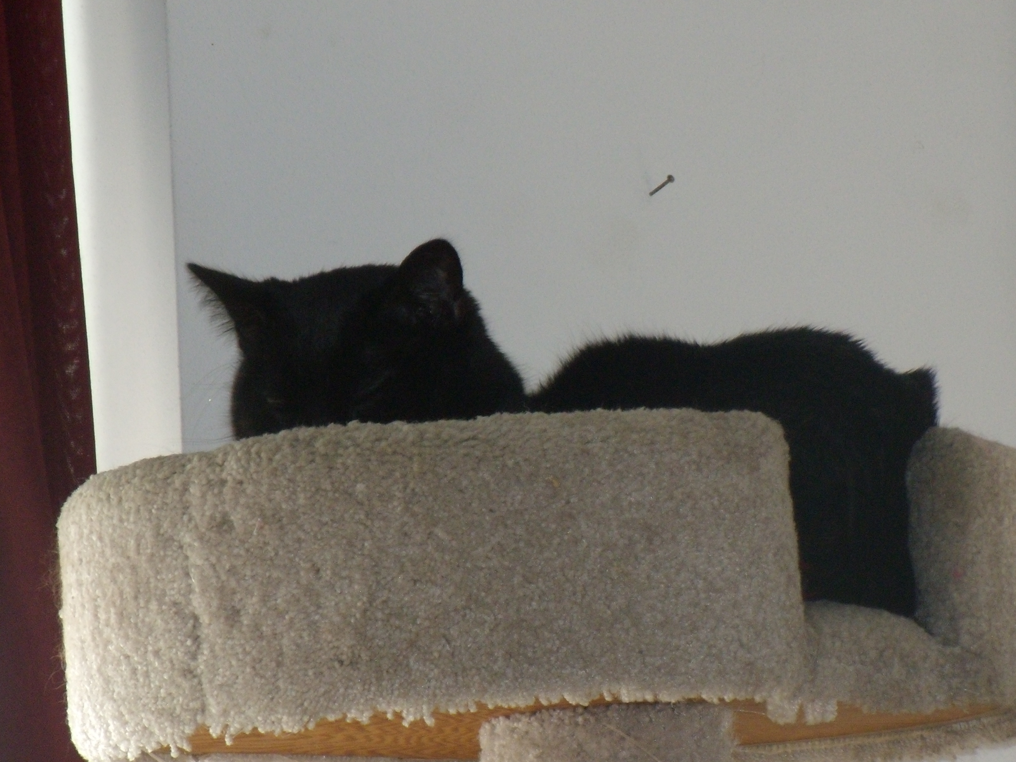 Well, things are some better although not perfect. Jake is spending more time out of the cupboard and on my lap but there is still some hissing and wailing when they get face to face. Yesterday on two occasions, they were both on my lap very visibly ignoring each other. Simon climbed up while Jake was asleep (or pretending to be) and lay next to him. I woke in the night to some hissing from the living room but no out and out fight like a few days ago. Wish I knew if this is for real or the medication. I’m still negative about drugging them with the antidepressant but they are calmer and both sleep a lot. We go on day by day watching–at least the medicine isn’t difficult to give, they don’t mind having their ears rubbed and apparently it doesn’t irritate them and they don’t seem to lick the residue from the fur.