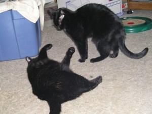 It’s been almost a year now since my sweet boys began their war. And it still goes on! We’ve gotten into a routine where we leave the gate open between the bedrooms and the living room when we are out here but make sure it is closed when Jake is here alone. Simon continues to resent Jake and Jake in his fear of much larger Simon hisses and growls often enough to keep Simon on edge too. Some of the time, it appears that Simon would like to be friends–he rolls over in his submissive way, but looks much more serious when he tries to chase Jake. Once upon a time, I fantacized letting them work it out, but Simon cornered Jake under the rocking chair and it looked pretty scary with loose fur flying.