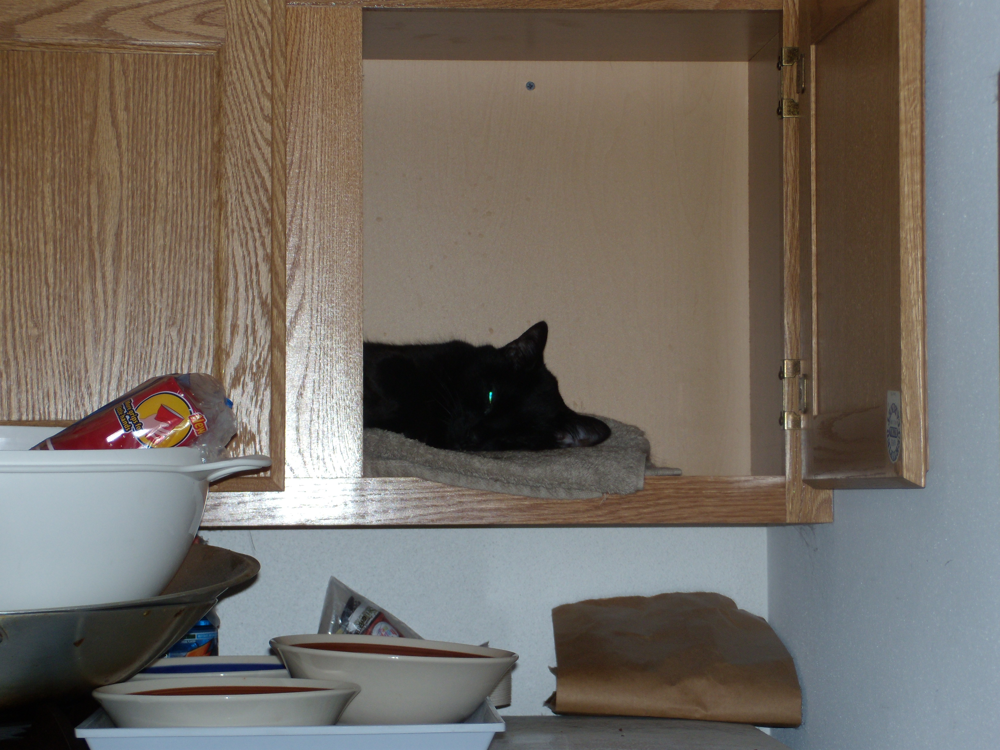 As you can see, Jake still has his own apartment in our condo. It’s been over a year and a half since the boys lay down together. I’m not sure who is the instigator–it seems like it’s a replay of the Hatfields and McCoys; what one doesn’t do to keep it going the other does. Jake is getting bored on his side of the gate and in the night I hear him jumping over it. I don’t know how much he walks around, but I think it’s mostly in the bathroom and hall. Simon is always sleeping on my lap and although his ears are up, he doesn’t jump down. I’m sure he would if he knew Jake was out there. Then after a few minutes, I hear the gate again as he leaps back into his half of the space. I think Simon would make friends as he usually lays down and goes on his back when Jake first hisses, but when Jake doesn’t stop, Simon has enough and he will hiss and if Jake is near the floor Sion chases him back up into the cupboard. So we have a respite from their antics for a while.