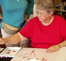 Well, back at painting class: This was the day for learning the “Third Gentleman” or the Chrysanthemum stroke. This was an actual object (like the bird I still have trouble with from Bamboo, and the graceful ribbons from the Wild Orchid). This was a flower and its leaves which is a similar stroke to the Wild Orchid, but curvier. I did fairly well (better than the ribbons and butterflies) with the basic flower, but the final treat was a Tiger Lily with its graceful petals and shy freckles. My lilies all looked like a kindegarten version of a flower in a pot and not graceful at all. I did get my new Haboku brush in the mail when I got home, but it is going to take more than an expensive brush to paint me a Tiger Lily!