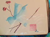 Today was the last class and I approached it with sadness. These lessons have been very instructive, and I feel I have learned a lot, although, I am far from being able to sit down and paint a Sumi-E painting. I still do my best work on the bamboo stalk, the leaves not so good. Sue assures me with practice my leaves won’t continue to be all ragged on the top but will someday end in a perfect sharp oval at the end. Today’s Gentleman was Plum Branch. This one is particularly hard for me; can’t seem to bend my wrist enough to get the ragged bark look to the branch. I’m still practicing all the things I do fairly well (I know! I need to practice the things I don’t do well), but it’s so depressing to continue to make ugly blobs of paint on my pad; I need to make some pretty bamboo and orchid leaves and chrysanthemums. I painted a greeting card with a bird standing on a twig and two plum blossoms. It looks pretty good, and when I got home, I framed it, so I have a picture of my work. It is also the photo that is on this blog. I will continue to practice daily and maybe some of my pictures will resemble those in the book. Thank you, Sue, for your optimistic approach.The cats! Last night, Jake decided to wander to the back of the condo (the part Simon lives in and is cut off from the living room by The Gate! Apparently, he was just seeing how far he could go and ended up in Eric’s room where he stayed for fifteen minutes or so. Simon was with me and sleeping very soundly and never knew Jake was back here. Jake is getting bolder–I think he is getting bored with everyone leaving him at night and shutting off the lights. Maybe this will be the key to them making up (I wish). It was 104 today in Madison. I’m about tired of these records we’re setting. We have to get the other car ready for Make a Wish and it’s too hot to work on it. Maybe the weekend will be cooler.