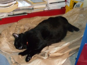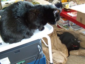 This is an update on the saga of the cats. Oh, they are still not friends, but Jake is getting bored with being in the living room all the time he’s not in his cupboard so is getting bolder. He now jumps down without checking for Simon, so there is a bit more running and chasing. When it’s treat time, he goes to the bin for his with Simon right below him eating his treats. In the night he’s taken to jumping the gate and visiting us, either the bathroom or once or twice in Eric’s room itself (Simon was on my lap asleep). If caught, Jake just jumps back over the gate into the living room and Simon is held up because he can’t jump anymore. He is really getting big. These are current photos of both of them, taken at approximately the same time.